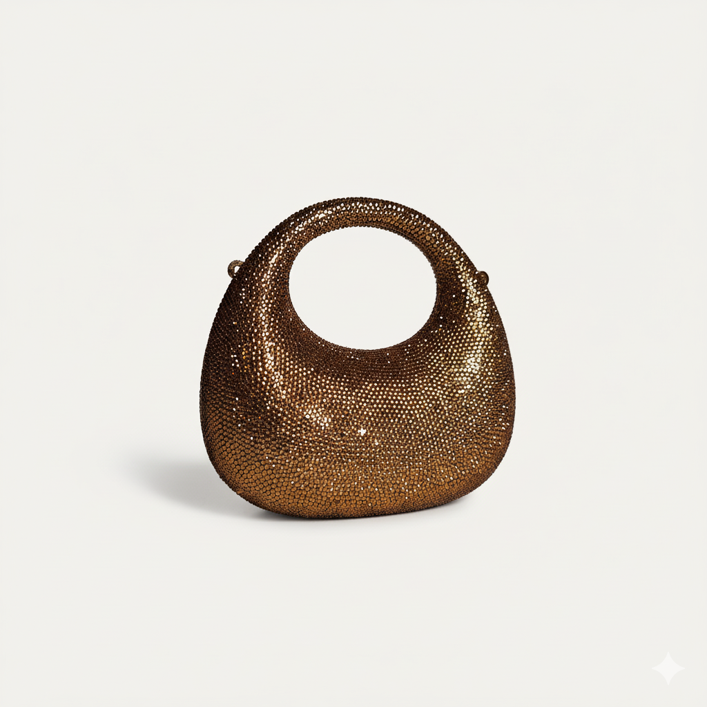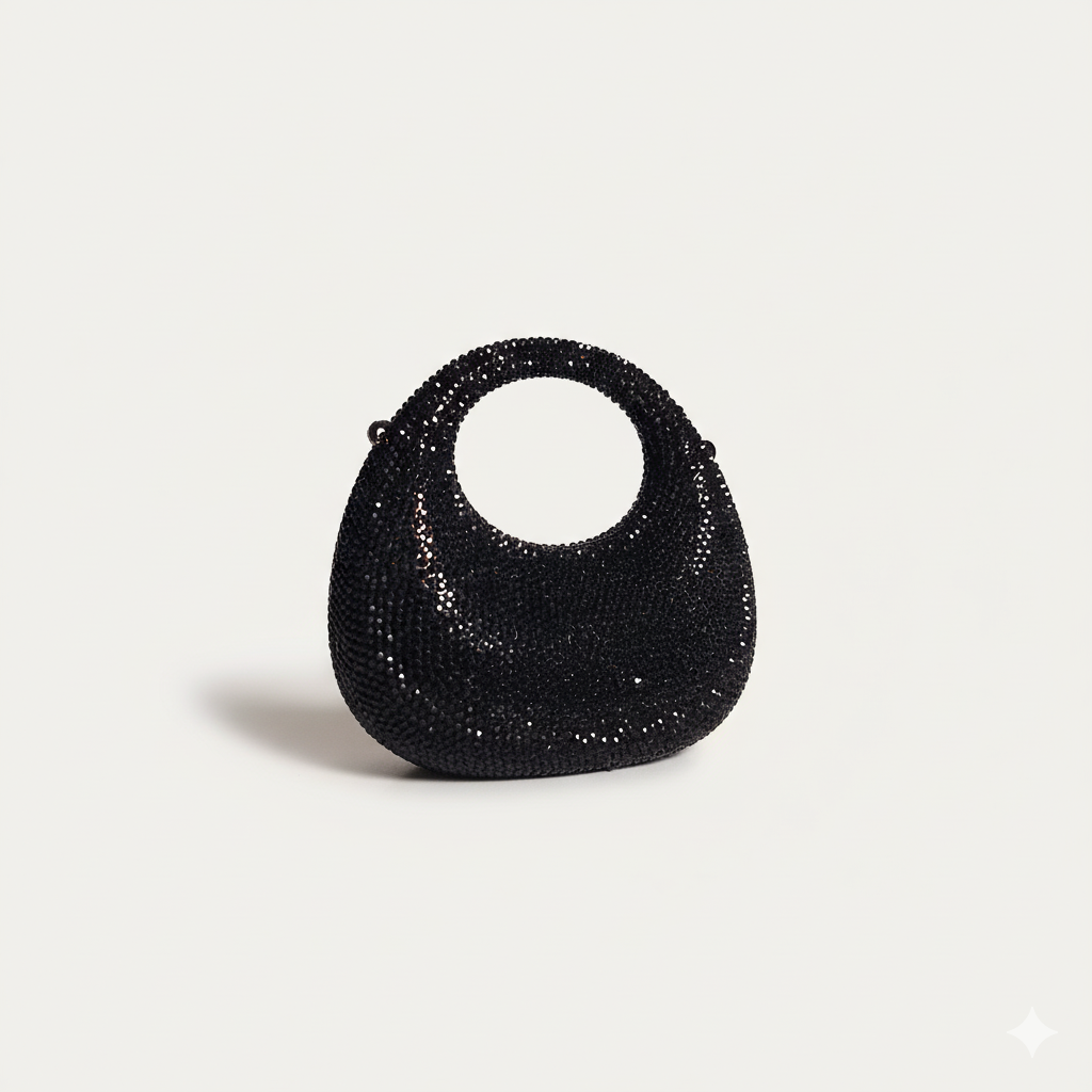 Introducing the Mini Handle Clutch. This luxurious clutch is adorned with shimmering Swarovski stones and boasts the most coveted design of the season. Elevate your style with this exclusive accessory that exudes elegance and sophistication. A must-have for any fashionista.